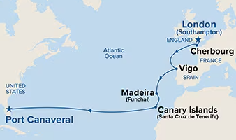 6 ports from Southampton (London) to Puerto Cañaveral (USA)