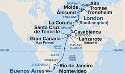 14 ports from Buenos Aires, Argentina to Southampton (London)