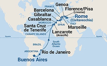 11 ports from Buenos Aires, Argentina to Rome (Civitavecchia), Italy